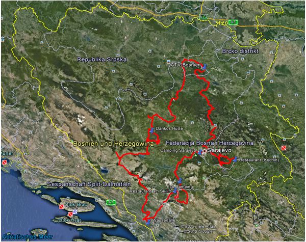 Gelber Strich = Landesgrenze Bosnien / roter Strich = TRANSBOSNA